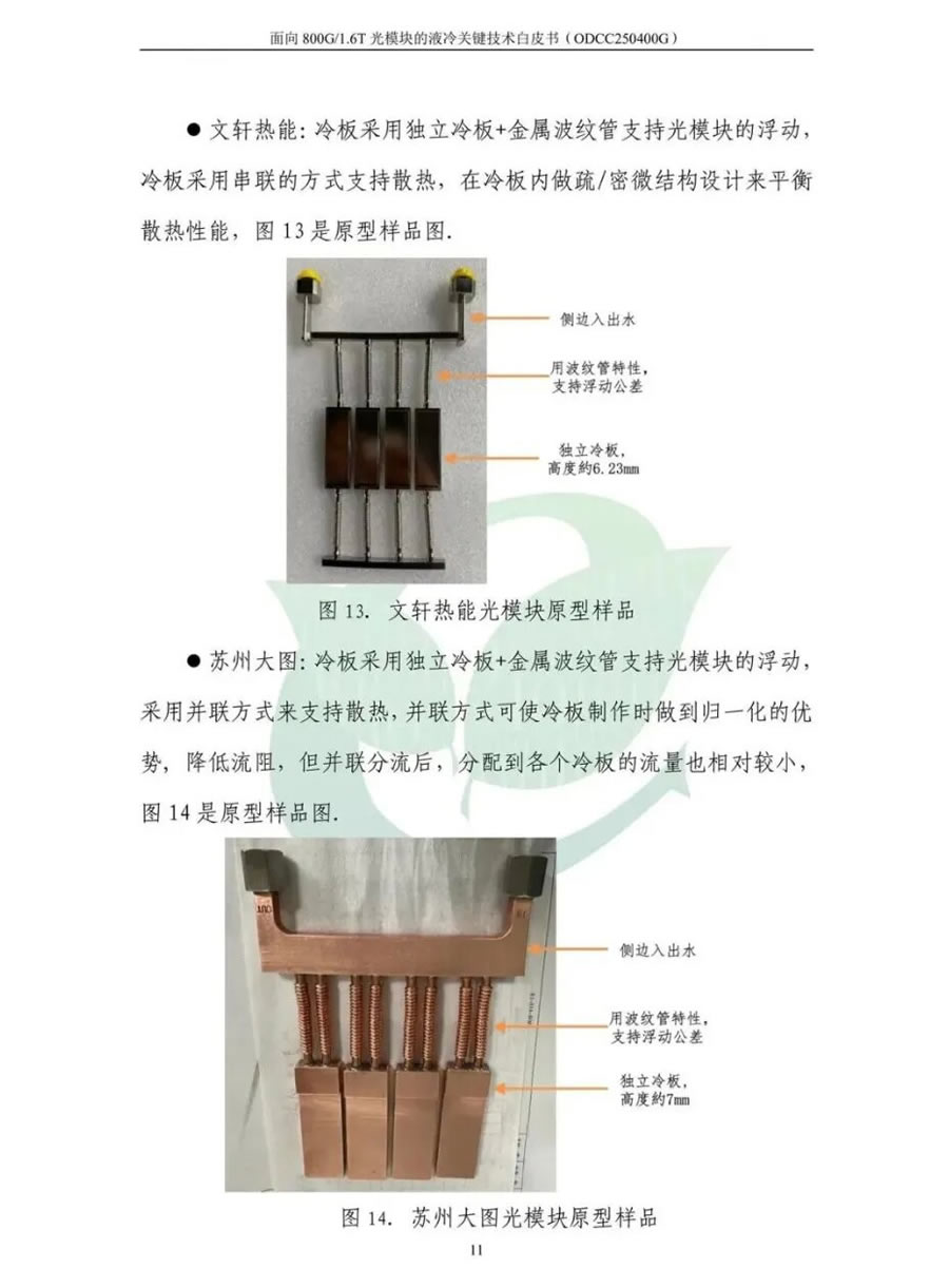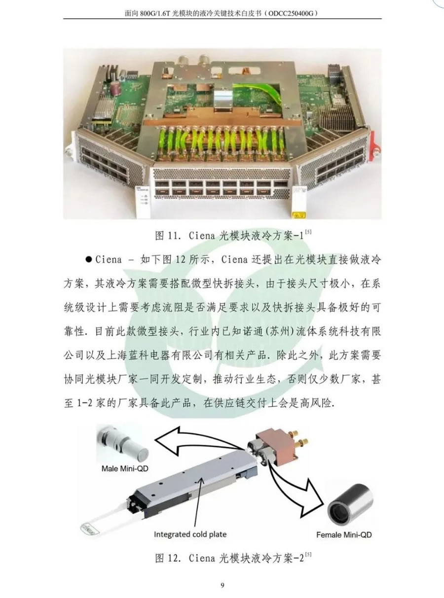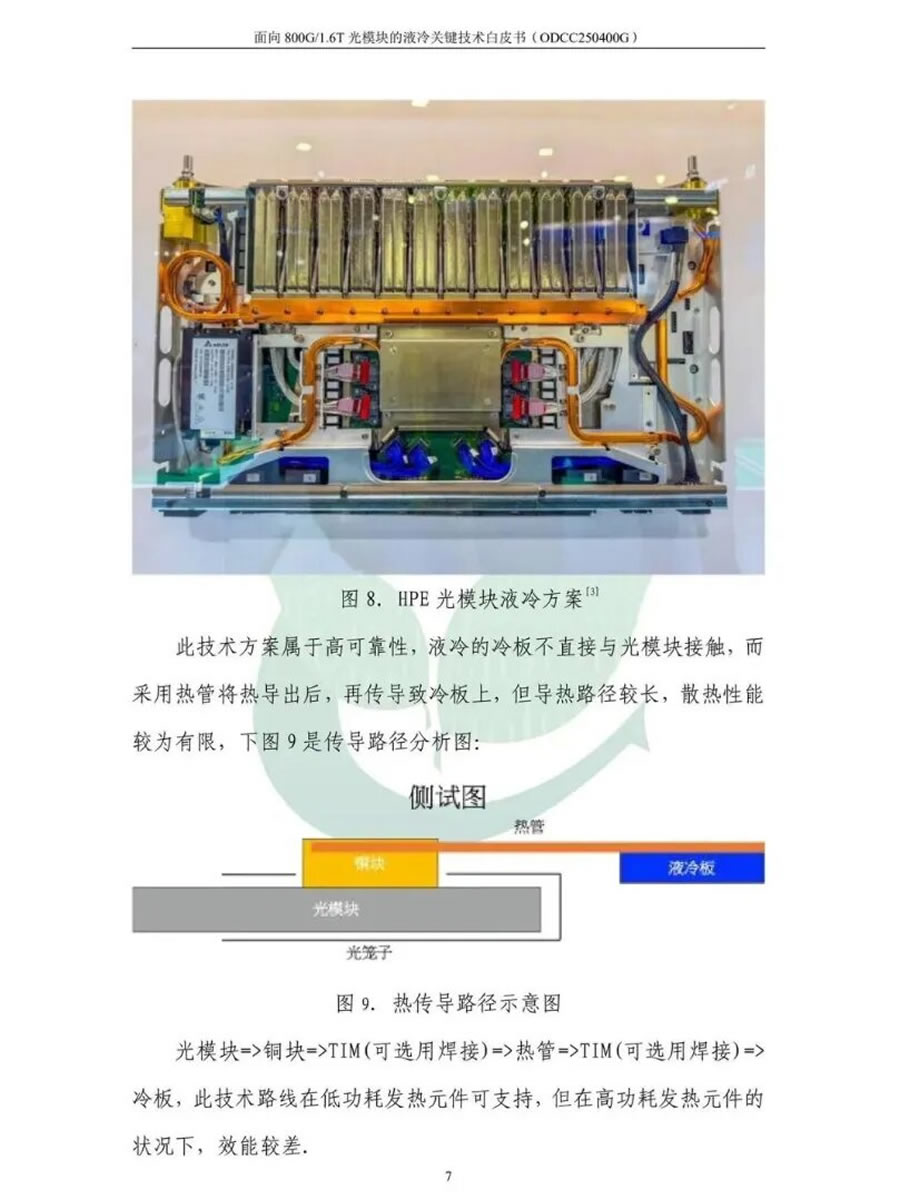 03.光模块主流液冷方式 光模块液冷主流分冷板式、直插式、浸没式、CPO集成式四大类,适配不同功率与场景。 ① 冷板式液冷(主流过渡方案) - 热管+冷板(间接):热管先导模块热量至远端冷板,再由水冷带走。优点:不直接接触、可靠性高、兼容现有设备;缺点:路径长、热阻大,仅适配≤800G。 - 一体式浮动冷板(直接):冷板直接贴模块,浮动结构补偿插拔公差。优点:路径短、效率高,适配1.6T;缺点:浮动机构需长期可靠性验证。 图片 ② 直插式液冷(下一代可插拔主流) - 冷板集成在模块本体,配微型快接接头,插入时电气+液冷同步盲配,消除干接触热阻。优点:散热效率最高、即插即冷,适配3.2T+;缺点:微型接头供应链少、成本高。 ③ 浸没式液冷(整机柜级) - 单相浸没:模块浸在介电流体中,靠显热+强制对流散热;优点:均匀散热、PUE≈1.09;缺点:需密封、维护复杂。 - 两相浸没:用低沸点氟化液(如FC-72),靠相变潜热吸热、冷凝回流;优点:近乎恒温、温差±1.5℃、PUE≈1.02;缺点:成本高、专用设计。 ④ CPO集成式液冷(未来方向) - 光引擎与交换芯片共封装,内置微流道/冷板,热源统一散热;优点:热预算共享、适配1.6T/3.2T;缺点:设计复杂、良率低、成本高。 总的来说:热管冷板,中高功耗用浮动冷板,超高速用直插式,整机柜用浸没式,CPO走集成微流道。 04.一些光模块液冷案例(来源ODCC)