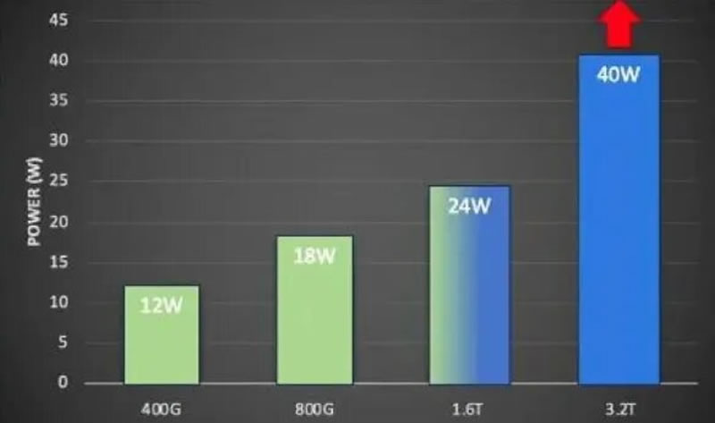 难点 ① :功耗与热密度爆炸(最核心) - 400G≈12W、800G≈18–30W、1.6T≈25–45W、3.2T预计40–55W+ - 热流密度超100W/cm2,远超风冷极限(约50W/cm2) - 温度每升10℃,激光器寿命减半、误码率飙升、波长漂移
