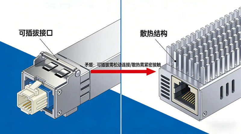 难点②:封装空间极度受限 - 主流QSFP-DD/OSFP紧凑封装,内部间隙仅0.1–0.5mm,无散热冗余 - 全金属气密封装,热量只能单向传导,无自然对流 - CPO中光引擎与电芯片共封装,热源叠加、互相干扰