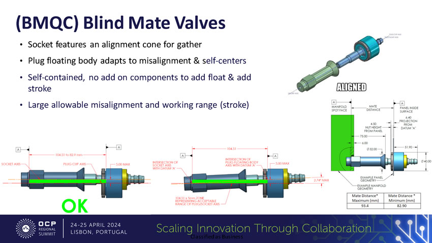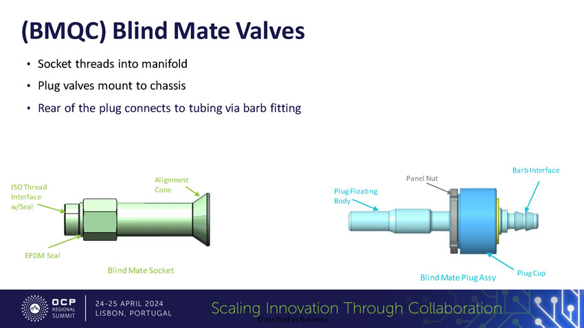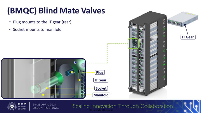 丹佛斯Hansen OCP开放式机架V3盲插快换接头(BMQC)是与OCP(开放计算项目)社区共同设计的,旨在为数据中心的热管理应用制定行业标准。该快换接头规格为5毫米,符合OCP规范要求。丹佛斯BMQC具有自动对准功能,可帮助在接入受限或可见度有限的位置进行连接,并保证100%氦气泄漏检测。Danfoss Hansen OCP Open Rack V3 Blind Mate Quick Connector (BMQC) has been designed with OCP (Open Compute Project) community to set industry standard for thermal management application in data centers. This quick disconnect coupling is available in size 5mm and complies with OCP specification requirements. Danfoss BMQC offers a self-alignment feature to help connect in location with limited access or visibility and guarantees 100% helium-leak testing on every coupling. 产品特征 - Danfoss Hansen OCP Open Rack V3 Blind Mate (BMQC) has been designed with OCP (Open Compute Project) Community to set industry standard for thermal management application in data centers.