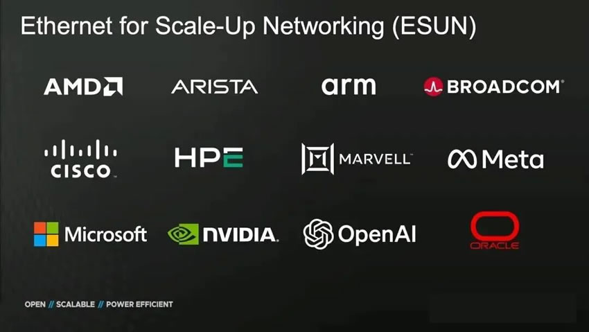 ESUN 规范打破垄断 AMD 、英伟达、 OpenAI 等 12 家行业巨头联合发布了 Ethernet for Scale - Up Networking ( ESUN )规范。 ESUN 聚焦搭建开放论坛,由运营商、设备商、芯片厂共同制定 Scale - Up 网络以太网方案,从物理层到传输层提供 “ 整栈标准 ” 。这一开放标准打破了 AI 集群专有协议的垄断,让不同厂商的芯片、交换机、光模块能够自由组合,不仅使 AI 硬件成本直接砍半,还可支撑 512 个以上 XPU 连片运行。