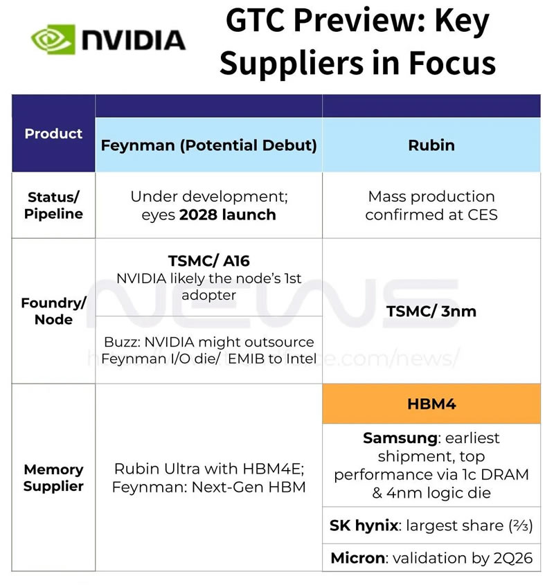 一边是面向2028年的Feynman架构首次揭开面纱,锚定台积电A16 1nm级工艺,完成NVIDIA在先进制程上的又一次卡位; 另一边则是Vera Rubin平台的核心底座HBM4全面登场,三星、SK海力士两大存储巨头将同台竞技,打响AI高带宽内存的军备竞赛。 一、GTC 2026的核心悬念:Rubin量产落地,还是Feynman提前亮剑?